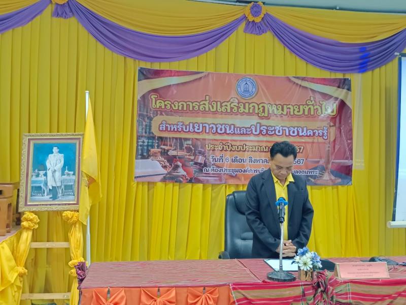 วันที่ 6 สิงหาคม 2567 ภายใต้การอำนวยการของนายสง่า เจริญยิ่ง นายกองค์การบริหารส่วนตำบลจอมพระ พร้อมด้วยคณะผู้บริหาร นางสาวโสภา เป็นสุข ปลัดองค์การบริหารส่วนตำบลจอมพระ ดำเนินโครงการส่งเสริมกฎหมายทั่วไปสำหรับเยาวชนและประชาชนควรรู้ ประจำปีงบประมาณ พ.ศ. 2567 โดยมีวัตถุประสงค์เพื่อเสริมสร้างความรู้ ความเข้าใจด้านกฎหมายและให้ประชาชนตระหนักถึงสิทธิและหน้าที่ของตนตามกฎหมาย เข้าถึงกระบวนการยุติธรรมได้โดยง่ายสะดวก และรวดเร็ว กลุ่มเป้าหมายประกอบด้วยผู้นำชุมชน ประชาชน จำนวน 55 คน โดยสำนักงานอัยการคุ้มครองสิทธิและช่วยเหลือทางกฎหมายและการบังคับคดีจังหวัดสุรินทร์ คือ นางสาววราภรณ์ บุญสิน รองอัยการจังหวัด